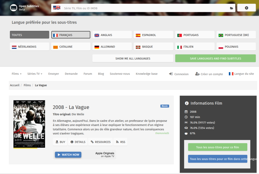 - Un catalogue immense : Vous y trouverez des sous-titres dans des dizaines de langues. C’est idéal pour différencier votre pédagogie (proposer de l’allemand aux élèves avancés et du français aux plus fragiles).